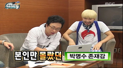 MBC ‘무한도전-PD 특집’에서 박명수가 자신의 존재감에 대해 다른 멤버들에게 묻자 최근 인터넷에 떠도는 ‘박명수 존재감’을 직접 검색했다.