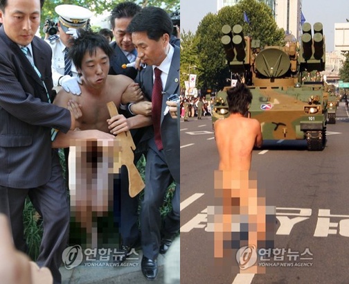 국군의 날 행사를 맞아 누드 시위를 벌인 ‘강의석’씨가 연행됐다.