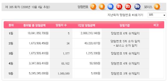 4일 실시된 제305회 나눔로또 추첨 결과 1등 당첨자 5명이 각각 20억821만원씩을 받게 됐다.