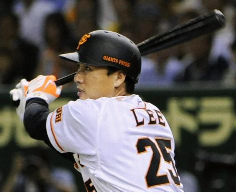 일본 프로야구 요미우리 자이언츠 이승엽이 8일 일본 도쿄돔에서 리그 1위 자리를 놓고 라이벌 한신과 벌인 경기 3회말 상대 투수 안도 유야의 바깥쪽 역회전볼을 그대로 밀어 친 뒤 공의 방향을 확인하고 있다.