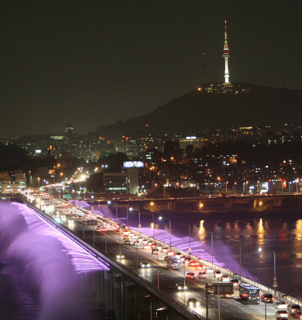 서울 반포대교 낙하분수가 서울의 새 명물로 등장했다. 9일 저녁 시험가동에 들어간 반포대교 분수는 한강 위 반포대교 570m 구간 양측에 380개의 노즐을 설치해 수중펌프로 끌어올린 한강물을 1분당 190t씩 내뿜는다. 한강르네상스 프로젝트의 하나로 추진한 초대형 분수다. 서울시는 반포대교 분수 설치 공사를 끝내고 이달 말까지 오후 7시, 8시 등 하루 2차례 시험가동한다고 밝혔다.(사진=연합뉴스)