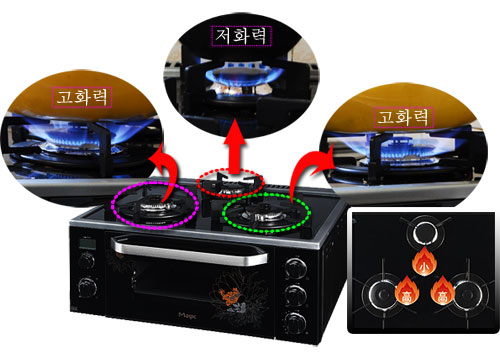 이와함께 이제품은 열효율을 높인 이중 고화력 버너와 대버너를 전면에 배치, 높은 화력으로 조리할수있도록 구조도 편리하게 개선했다.