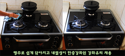 내열강화 글라스 상판은  온도상승 억제와 가스렌지의 불꽃열이 상판으로 번져가는 것을 차단한 히트커버링과 특수실리콘 채용등을 통해 안전성을 획기적으로 개선했다.