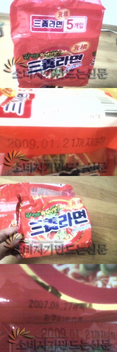 유통기한이 무려 1년이 넘은 제품을 먹었다는 생각에 기막혔던 정씨는 번들 포장지를 확인하고 다시 한 번 놀랐다. 겉 포장지에는 '2009 . 01 . 21 까지'라고 기재되어 있었던 것. 분리 수거해 둔 개별 제품 포장지를 찾아보자 모두 2007년 제품이었다.