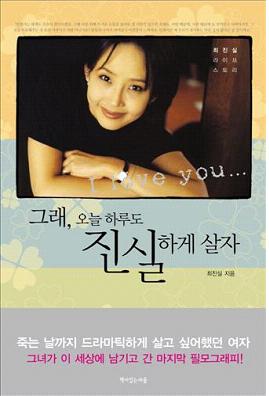 출판사 '책이 있는 마을'은 15일 최진실의 자서전 '그래, 오늘 하루도 진실하게 살자'라는 책을 발간했다. '최진실 라이프 스토리'라는 부제 아래 '죽는 날까지 드라마틱하게 살고 싶어했던 여자. 그녀가 이 세상에 남기고 간 마지막 필모그래피'라는 띠 포장이 둘려 있다.
