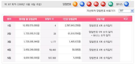 4등 5만9400명은 5만8085원, 5등 93만7908명은 5000원을 받는다.