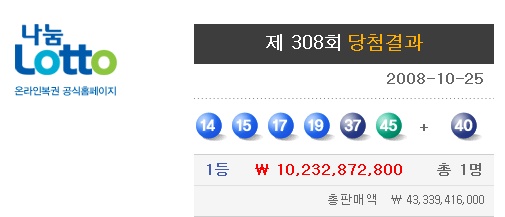 25일 실시된 제 308회 나눔로또 1등 당첨번호는 '14, 15, 17, 19, 37, 45'번이고, 2등 보너스 번호는 40번이다.
