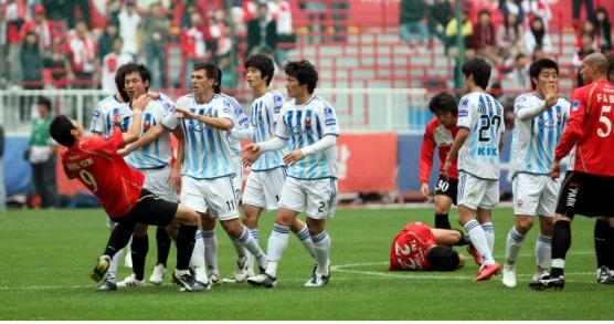 (사진=서울 이청용의 거친 반칙으로 양팀선수들이 신경전을 벌이는 과정에서 부산 정성훈(맨왼쪽)이 서울 데얀에 밀려 넘어지고 있다. 연합뉴스)