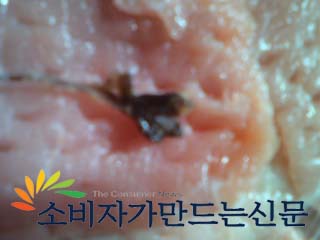 경기도 의왕시 삼동의 박모씨는 지난 1일 롯데마트 구로점에서 포크커틀릿용으로 구입한 등심(10장)에서 알 수 없는 이물질을 발견했다. 조리하기 위해 포장지를 벗겨내고 한 장을 집어 올리던 중 패트 사이에 까맣고 긴 '말린 개구리 다리'처럼 보이는 이물질이 떡하니 놓여 있었던 것.