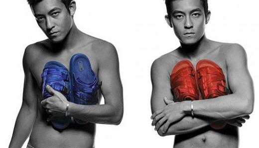 사진을 보면 진관희가 상반신을 노출한 채 파란색과 붉은 색의 신발로 가슴 부위를 가리고 있다.