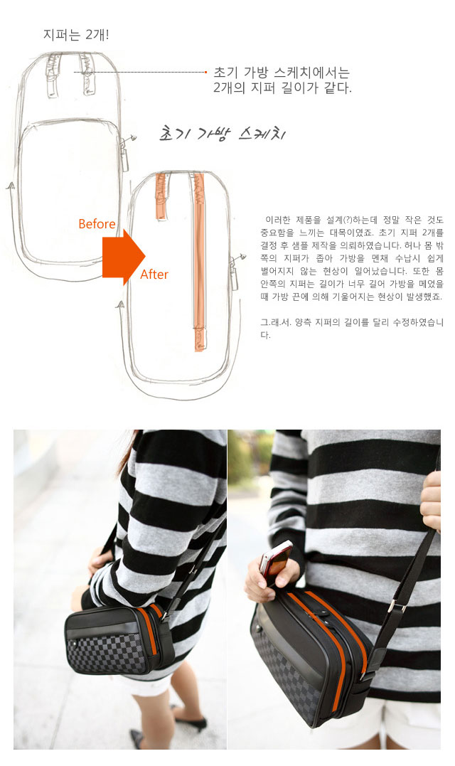 메인 지퍼(수납공간)를 하나만 만들려던 생각이 있었죠. 이 부분으로도 역시 많은 의견