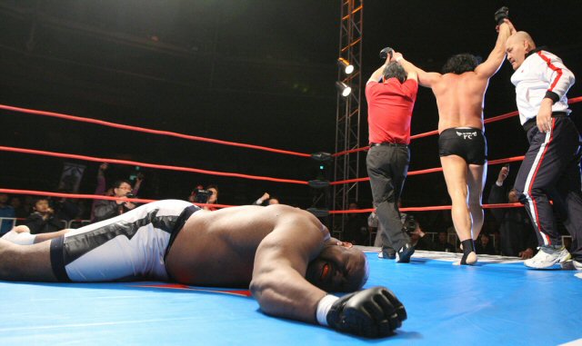 URL복사 기사공유하기 스크랩 프린트 메일보내기 글씨키우기 12일 서울 올림픽공원 제2체육관에서 열린 고 김일 추모 프로레슬링 대회 포에버 히어로 세번째 메인이벤트 이왕표에게 진 밥샙이 캔버스에 엎드려 있다. 이왕표는 경기 시작 1라운드 1분57초 만에 암바(팔꺾기 기술)로 밥샙을 제압했다. 경기가 너무 싱겁게 끝나자 관중석에서 '우~'하는 야유가 터져 나오기도 했다.(사진=연합뉴스) 저작권자 © 소비자가 만드는 신문 무단전재 및 재배포 금지 스포츠 연예팀 다른기사 보기 URL복사 기사공유하기 주요기사 아이돌 콘서트 VIP석 앉으려면 '사운드 체크' 사실상 강제…팬들 뿔 [황당무계] 21살 여대생에게 '목돈 마련용' 이라며 치매보험 팔아 연속혈당측정기 '덱스콤 G7' 기기 오류에도 환불 책임 3각 핑퐁 HD조선해양 수주 목표 초과, 한화오션 100억달러 돌파 '好好' 박현주 4.2조, 김남구 2.3조...증권주 폭등으로 오너 주식가치 '껑충' [AI시대의 그늘-AI태풍이 분다④] 은행권, AI로 피싱 잡고 대출 심사