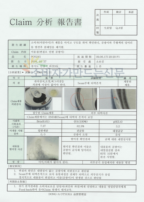 곧바로 동아오츠카 고객센터로 연락했지만 '업무시간 종료'라는 음성안내만 반복되어 메모를 남길 수밖에 없었다. 다음날 어렵게 통화가 이루어져 이틀 후인 28일 담당직원이 방문했다. 직원은 '파손된 포장재로 공기가 유입되어 변질 된 것'이라고 상황 설명을 했다.