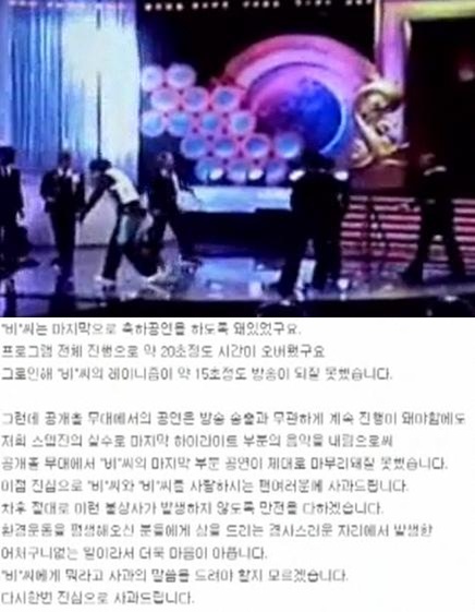 이어 "공개홀 무대의 공연은 방송 송출과는 무관하게 계속 진행돼야 함에도 스태프들의 실수로 비의 마지막 공연 부분이 제대로 마무리 되지 못한 점, 비와 비의 팬 여러분께 사과드린다"라고 말했다.