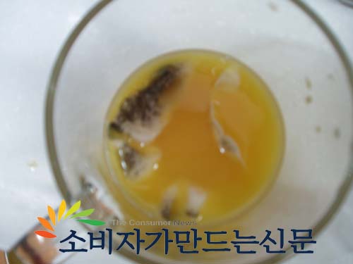 담당자는 "이물질은 곰팡이류로 제조과정에서는 절대로 생기지 않는다. 유통과정에서 주스뚜껑의 진공이 깨져 공기 유입이 된 것 같다"고 설명했다.