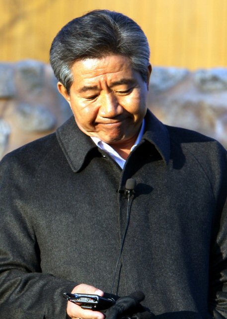 노무현 전 대통령이 30일 오후 고향인 경남 김해시 진영읍 봉하마을 사저 앞에서 열린 관광객들과의 만남에서 세종증권 매각 비리 의혹에 연루된 형 건평씨에 대한 검찰수사에 대해 기자의 질문을 받자 난감한 표정을 짓고 있다.(첫번째 사진)