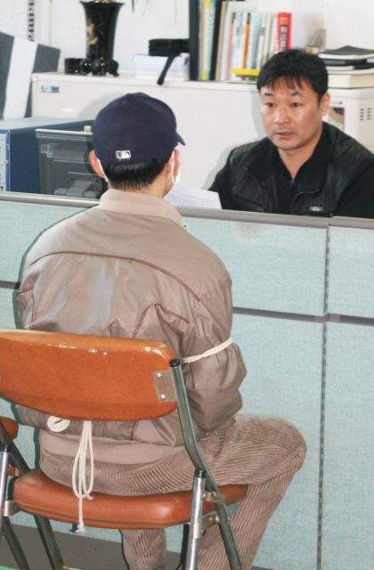 부모와 아내와 딸을 살해한 혐의로 구속돼 2년 전 불을 질러 부모를 숨지게 한 범행까지 들통 난 김모씨(42)가 30일 충북 옥천 경찰서 형사와 눈싸움을 하며 조사를 받고 있다.