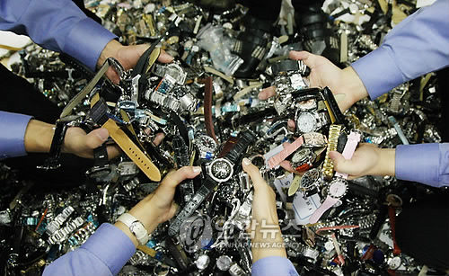경찰 3명이 압수한 짝퉁 시계 7000여점(정품시가 1000억원)을 들어보이고 있다(사진=연합뉴스).
