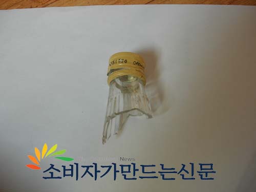포장 불량인지 힘을 가해도 뚜껑이 열리지 않아 오른손으로 병 부분을 잡고 왼손으로 돌리는 순간 병의 목 부분이 깨지며 오른손 엄지손가락을 스치고 지나갔다.