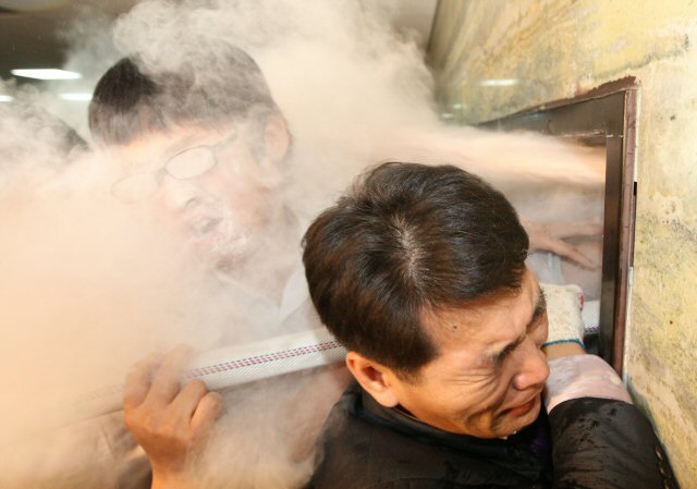 한미 FTA 비준안 상정일인 18일 오후 국회 외교통상통일위원회 앞에서 민주당 당원들이 한나라당의 한미FTA비준안 단독 상정을 막기 위해 회의장 내로 진입을 시도하다가 회의장 안에서 쏘는 소화기 분말을 뒤집어 쓰고 있다.