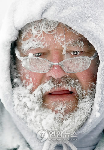 사진은 지난 19일 미국 위스콘신주 애플턴에서 블로잉 노우가 몰아쳐 운전도중 얼굴과 수염에 눈이 엉겨붙은 존 노트바트씨의 모습을 담고 있다.