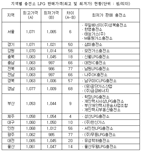 전국에서 가장 싼 충전소는 광주광역시의 무등LPG 충전소로 ℓ당 985원인 것으로 조사됐다.