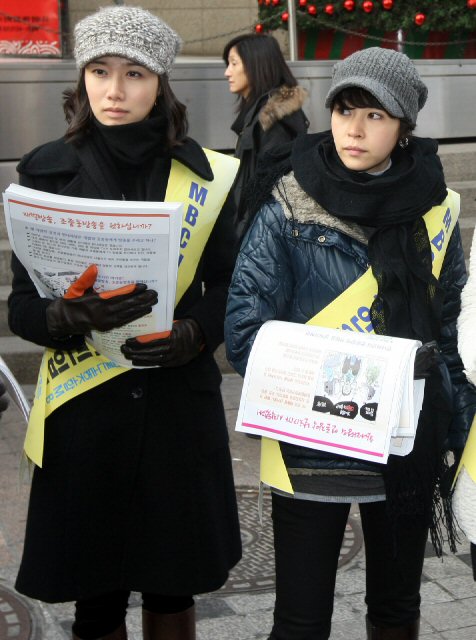 MBC 뉴스데스크 박혜진 앵커와 나경은 아나운서가 27일 오후 명동에서 MBC노조파업의 정당성을 알리는 거리홍보에 참여하고 있다.