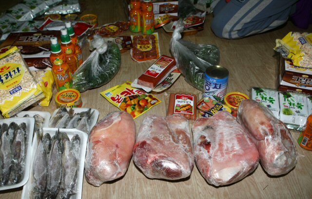 `돼지족발 1㎏, 마른 조기 1㎏, 도시락 김 1봉, 소시지 160g, 햄버거스테이크 200g, 초코파이 720g, 쌀과자 100g, 살코기 참치 150g, 오렌지 음료수 300㎎'등 푸짐하다.