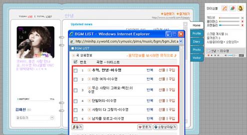 그의 말대로 미니홈피 배경 음악은 이수영의 추억 안녕, 무슨 사랑이 그래요, 단발머리, 사랑이 다 그렇지, 남자를 모르고 등으로 채워져 있다.