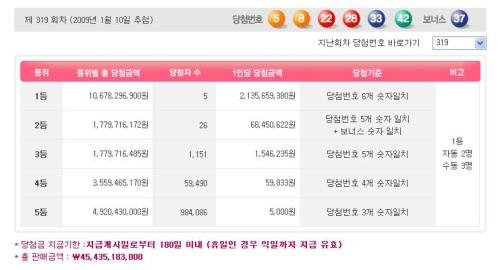 10일 추첨한 제319회 나눔로또 추첨결과 5, 8, 22, 28, 33, 42번이 1등 당첨번호가 됐다. 2등 보너스 번호는 37번이다.