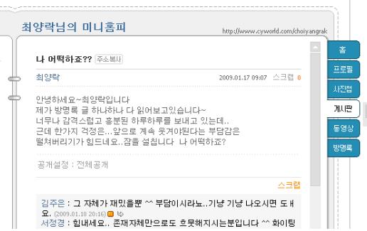 이에 최양락의 미니홈피를 찾은 많은 네티즌들은 "너무 부담갖지 마세요. 그냥 있는 모습 그대로 보여주세요" "국민들이 최양락씨에게 바라는 건, 늘 웃기는 게 아닌 언제나 유쾌하고 따뜻한 국민 형, 동생, 선배, 후배, 친구다"라며 응원의 말을 더했다.