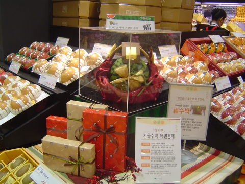 대구백화점측은 이 수박을 설 제수 음식과 선물을 구매하러온 고객들이 볼 수 있도록 전시를 해 놓고 있다.