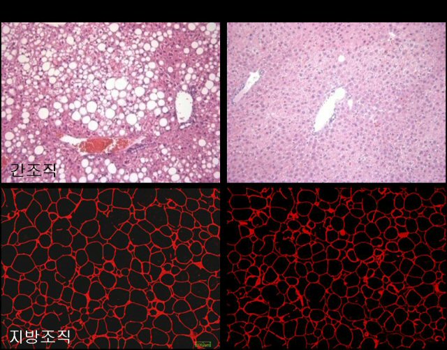 사진은 비만 쥐에게 신약물질(βL)을 8주간 투여한 뒤 간(위 2장)과 복부 지방조직(아래 2장)의 변화 모습. 간에 있는 지방(흰색)이 현저하게 줄었고(위 오른쪽), 복부 지방세포 각각의 크기도 투여 전(아래 왼쪽)보다 크게 작아졌다(아래 오른쪽).