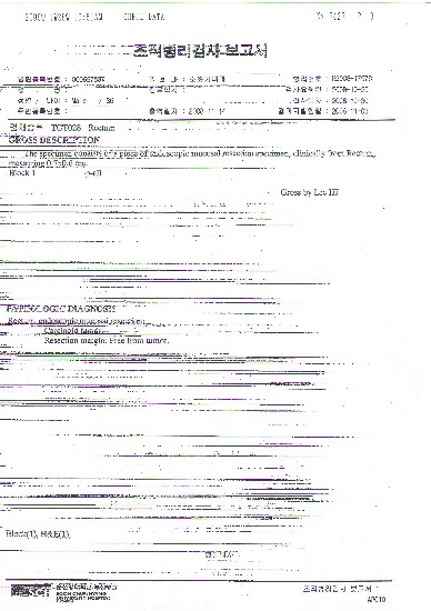 2개월이 지난 뒤에야 손해 사정인은 “가톨릭의대에 조직검사 결과지를 보내 소견서를 요청했다. 악성종양이 아닌 양성종양(경계성종양, 질병분류번호:D37.5)이라는 소견서를 받았고, 이를 바탕으로 암 진단자금의 20%인 200만원만 지급할 수 있다”고 통보했다.