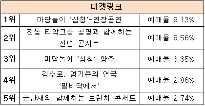 URL복사 기사공유하기 스크랩 프린트 메일보내기 글씨키우기 이제 얼마 안 있으면 우리 고유의 명절 설날이다. 올해는 안타깝게도 경기침체와 어려운 경제 불황 속에서 시작하게 되었다. 그래서 이번 설날은 가족과 친지들과 함께 그 어느 때보다 따뜻한 시간을 보냈으면 하는 바람이다. 이번 1월 넷째 주 공연랭킹을 보면서 오랜만에 만나는 이들과 한편의 공연으로 끈끈한 정을 더욱 돈독하게 만들어보자. [뉴스테이지= 박하나 기자](뉴스검색제공제외) 저작권자 © 소비자가 만드는 신문 무단전재 및 재배포 금지 뉴스테이지 제공 다른기사 보기 URL복사 기사공유하기 주요기사 현대차, 매출 186조 ‘역대 최대’...관세 손실 4.1조에 영업익 20%↓ 현대건설, 업계 최초 K-택소노미 녹색채권 발행…목표액의 5배 자금 모으며 흥행 LG전자, 무디스 신용등급 ‘Baa1’로 5년 만에 상향…"1~2년 내 실적 반등 기대" 신한금융, 전북혁신도시에 ‘자산운용·자본시장 핵심 허브’ 구축 신복위 취약채무자 특별면책 대상 1500만 원→5000만 원 확대 김동연의 결단, 소방공무원 16년 숙원 풀었다…경기도, 미지급 수당 341억 지급 결정