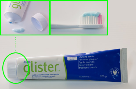 또 치약을 오래 사용하다보면 용기 안의 치약이 비는 만큼 치약이 위쪽으로 잘 밀려 올라가 주어야 하는데 기존 알루미늄 용기는 그 점이 여의치 않아 마지막엔 쓸 때마다 손으로 긁어 올려야 한다. 글리스터 치약은 다른 치약보다 묽고 점성이 부드러워 쉽게 밀려 올라가고 넓은 뚜껑을 받침삼아 거꾸로 놓으면 매번 편리하게 짜낼 수 있다.