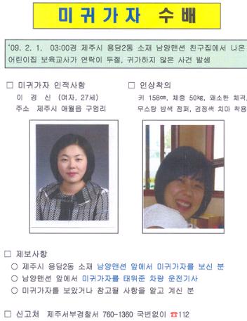 제주서부경찰서는 전의경 대원 등 300여 명을 동원해 제주 J어린이집 교사 이경신 씨(27, 여)의 휴대전화 신호가 마지막으로 잡힌 광령초등학교 인근을 중심으로 수색작업을 벌이고 있다.