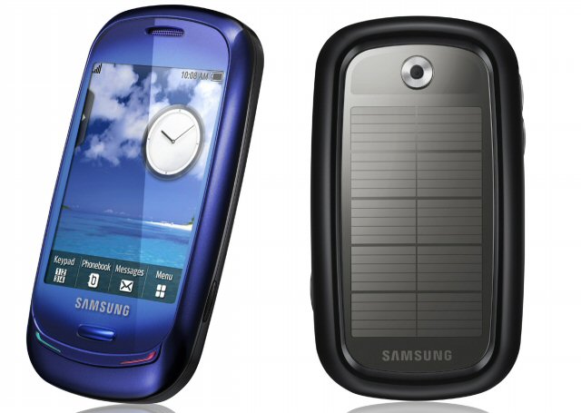 삼성전자의 태양광 에너지폰 '블루어스(Blue Earth.위 사진)'는 소재와 생산과정, UI(사용자환경), 패키지 등도 친환경 컨셉트를 유지했다. 외관 케이스는 플라스틱 생수통을 재활용한 PCM(Post Consumer Material) 소재로 제작됐다. 인체와 환경에 해로운 브롬계 난연재, 베릴륨, 프탈레이트 등 유해 물질은 사용되지 않았다.