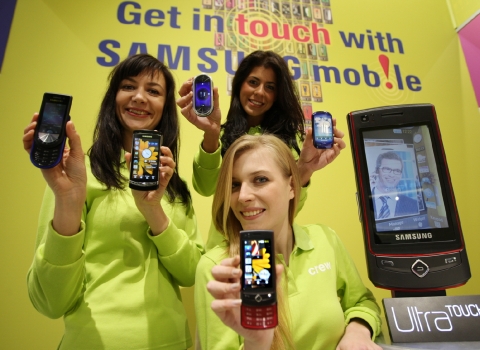 (삼성전자 도우미들이 전시장 앞에서 첨단 프리미엄 풀터치스크린폰인 비트DISK, 옴니아 HD, 비트DJ, 태양광 충전 블루어스폰, 울트라터치(왼쪽부터 시계방향)를 선보이고 있다.)