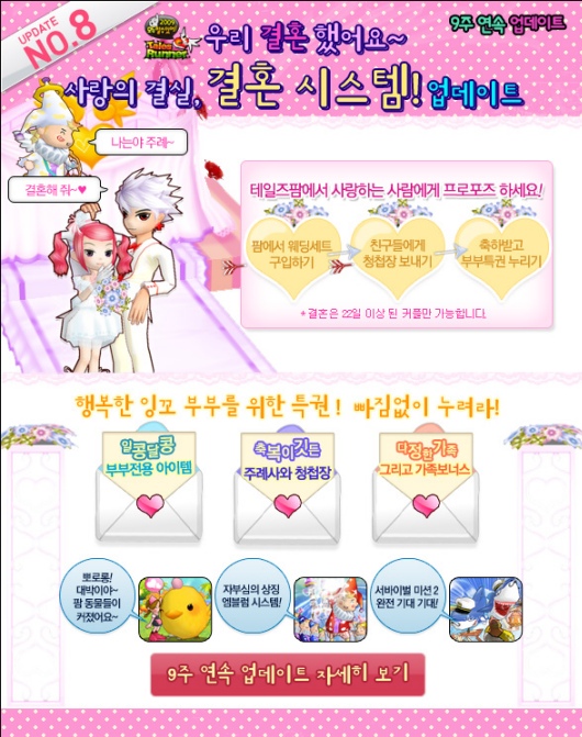 커플들은 ‘결혼시스템을’ 통해 친구들에게 결혼을 알리는 청첩장을 보낸 후 게임 속 나만의 공간 ‘테일즈 팜’에서 친구들의 축하 속에 결혼을 치를 수 있다.