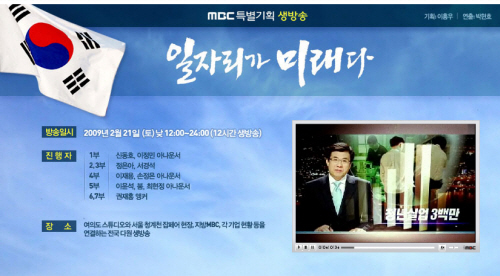 한편, MBC가 우리나라의 일자리 문제를 해결하기 위한 방안을 모색하고자 제작한 ‘일자리가 미래다’는 21일 낮 12부터 밤 12시까지 12시간 진행되며 신동호, 이정민, 이재용, 손정은, 최현정 아나운서들이 진행한다.