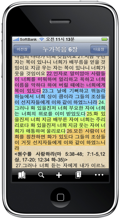 성경 애플리케이션은 단순한 열람기능 뿐 아니라 아이폰의 특성을 효과적으로 적용시킨 본문 검색기능, 구절별 하이라이트 기능을 제공한다. 특히 메모기능이 탁월해 문자메모 뿐 아니라 음성메모 등도 남길 수 있다.