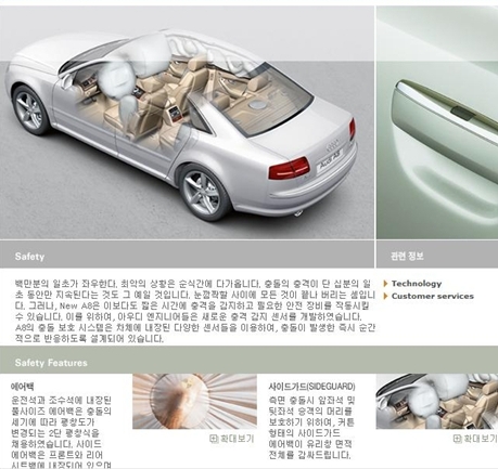 차량 내부 곳곳에 에어백이 설치돼 있고 새로운 충격감지 시스템을 내장, 충돌 발생 즉시 에어백이 순간적으로 반응하도록 설계돼 안전 만큼은 보장한다는 아우디 측의 홍보만 믿고 차를 구입했다.