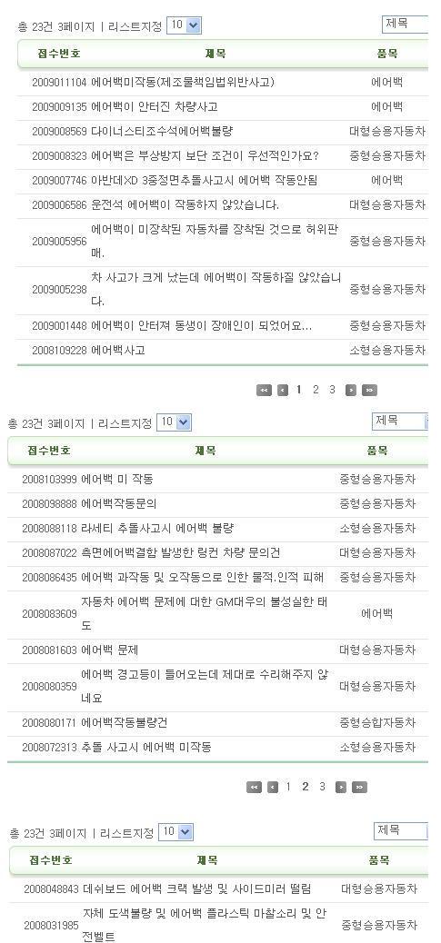 (한국소비자원에 인터넷을 통해 접수된 에어백 관련 소비자 상당 신청 리스트. 추돌,충돌등 큰 사고에도 불구하고 에어백이 작동하지 않았다는 내용이 대부분을 차지하고 있다. 아무리 하소연을 해도 보상 받는 비율이 거의 제로다. 소송을 하고 싶어도 막강한 변호사와 법무법인을 거느리고 있는 대기업과 맞서 싸울 엄두조차 내지 못하고 자포자기하고 있다.)