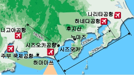 또 지리적으로 일본의 주요 간선인 도쿄와 나고야의 중간에 위치해 두 지역의 상용수요를 나눌 수 있는 역할도 가능하다는 것이 아시아나항공의 판단이다. 아시아나항공은 인천-시즈오카 노선에 177석 규모의 A321기를 투입해 주 7회 운항할 예정이다.