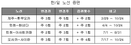 하계 성수기에 인기를 얻고 있는 빼어난 풍광의 아사히카와 노선도 증편키로 했다. 엔화강세로 일본인 관광객 수요가 증가함에 따라 하계 성수기에 오사카~사이판 직항 노선 증편도 검토중이다. 내년 3월에는 이바라키 공항 개항에 맞춰 인천-이바라키 노선을 주 7회 신규 운항할 계획이다
