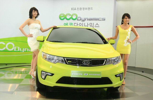 24일 오전 서울 압구정동 기아차 국내영업본부 사옥에서 열린 기아차 친환경 브랜드 'Eco Dynamics' 발표회에서 모델들이 포르테 LPI 하이브리드카를 선보이고 있다.