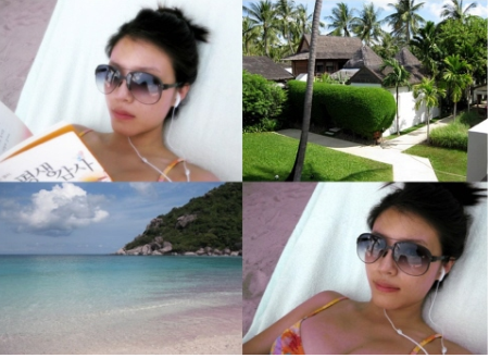 정시아는 지난 23일 자신의 싸이월드 미니홈피 사진첩에 태국 코사무이에서 4박 5일간 다녀온 신혼여행지에서 수영복을 입고 야자수 그늘 아래서 책을 읽고, 일광욕을 즐기는 등 행복한 순간이 담긴 사진을 올렸다.