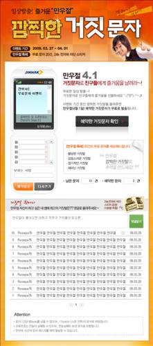 보내고 싶은 거짓유머 문자를 이벤트페이지에 예약하면 만우절 당일 지정해 둔 번호로 발송되는 것. 무료 최대 20건까지 가능하며 누구나 참여할 수 있다.