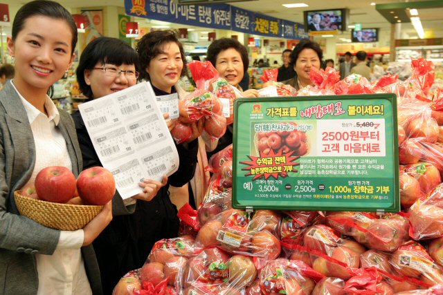URL복사 기사공유하기 스크랩 프린트 메일보내기 글씨키우기 신세계 이마트가 2일부터 일주일간 정상가 5천4백80원인 '당(糖)찬사과'를 소비자가 원하는 가격대(하한선 2천500원)로 판매하는 행사를 연다. 고객이 2천500원 이상으로 구매할 경우 초과금액은 사과단지 농촌의 불우학생 장학금으로 기부될 예정이다. 1일 서울 이마트 용산역점에서 주부들이 행사품목인 '당(糖)찬사과'에 원하는 가격표를 붙이며 즐거워하고 있다.(사진=연합뉴스) 저작권자 © 소비자가 만드는 신문 무단전재 및 재배포 금지 유성용 기자 다른기사 보기 URL복사 기사공유하기 주요기사 SK텔레콤, '1인당 10만원' 보상안 불수용..."재무적 부담 감당 어려워" 위메이드, 원화 스테이블코인 전용 ‘스테이블넷’ 테스트넷 공개 크래프톤, ‘배틀그라운드 모바일’·‘킹 오브 파이터즈’ 컬래버레이션 진행 하나증권 지난해 순이익 2120억 원…전년 대비 6% 감소 금융투자협회 조직개편 단행, K자본시장본부·대외협력부 신설 함영주 하나금융 회장 "비은행 수익성 회복되면 ROE 12% 도달 가능"